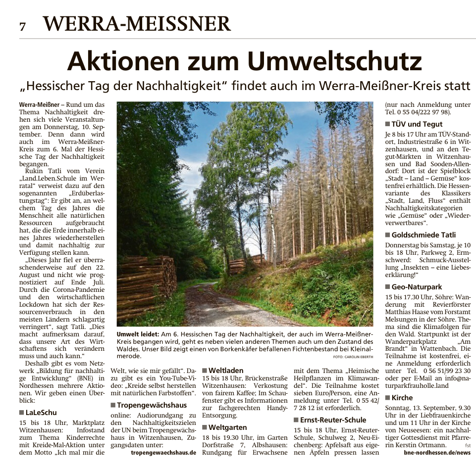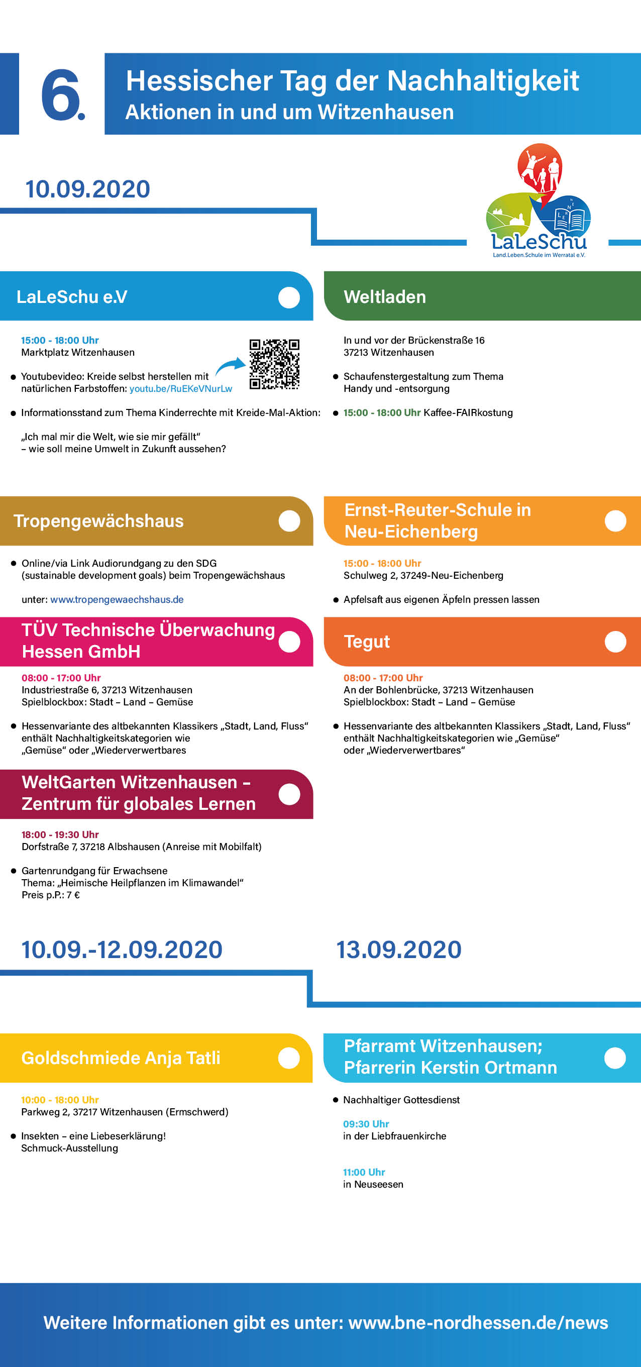 Veranstaltet vom BNE-Netzwerk Nordhessen wird es in Witzenhausen am 10.9.20 zum und um den Tag der Nachhaltigkeit mehrere Aktionen zu nachhaltigen Themen geben: