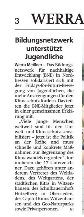 "Werra-Meißner – Das Bildungsnetzwerk für nachhaltige Entwicklung (BNE) in Nordhessen solidarisiert sich mit der Fridays-for-Future-Bewegung von Jugendlichen, die mehr Anstrengungen für den Klimaschutz fordern. Das teilten die BNE-Mitglieder jetzt in einer gemeinsamen Erklärung mit. „Viele junge Menschen weltweit sind für den Umwelt- und Klimaschutz sensibilisiert – jetzt ist die Politik an der Reihe und muss schnelle und konkrete Maßnahmen zur Begrenzung des Klimawandels ergreifen“, formulieren die 17 Unterzeichner. Dazu gehören unter anderem Vertreter des Weltladens, des Weltgartens, der städtischen Kitas in Witzenhausen, des Schulbauernhofs Hutzelberg in Oberrieden, des Capitol Kinos Witzenhausen und des Geo-Naturparks sowie Privatpersonen."